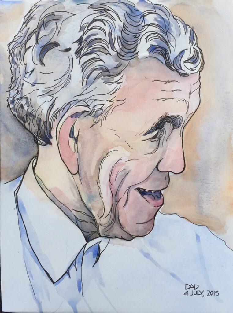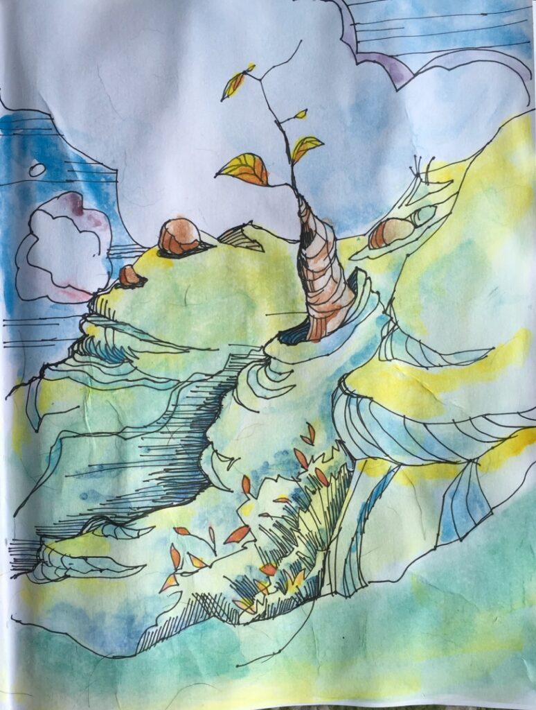 More like a doodle. On drawing paper; you can see the rippling from the watercolor.