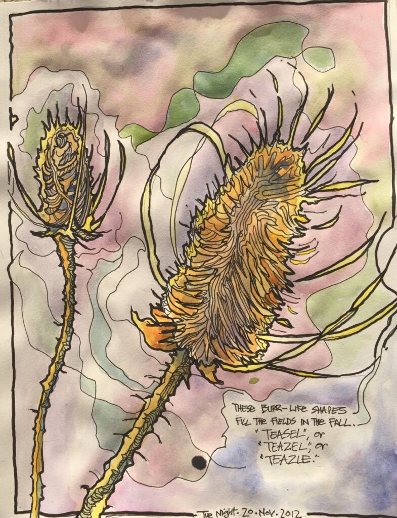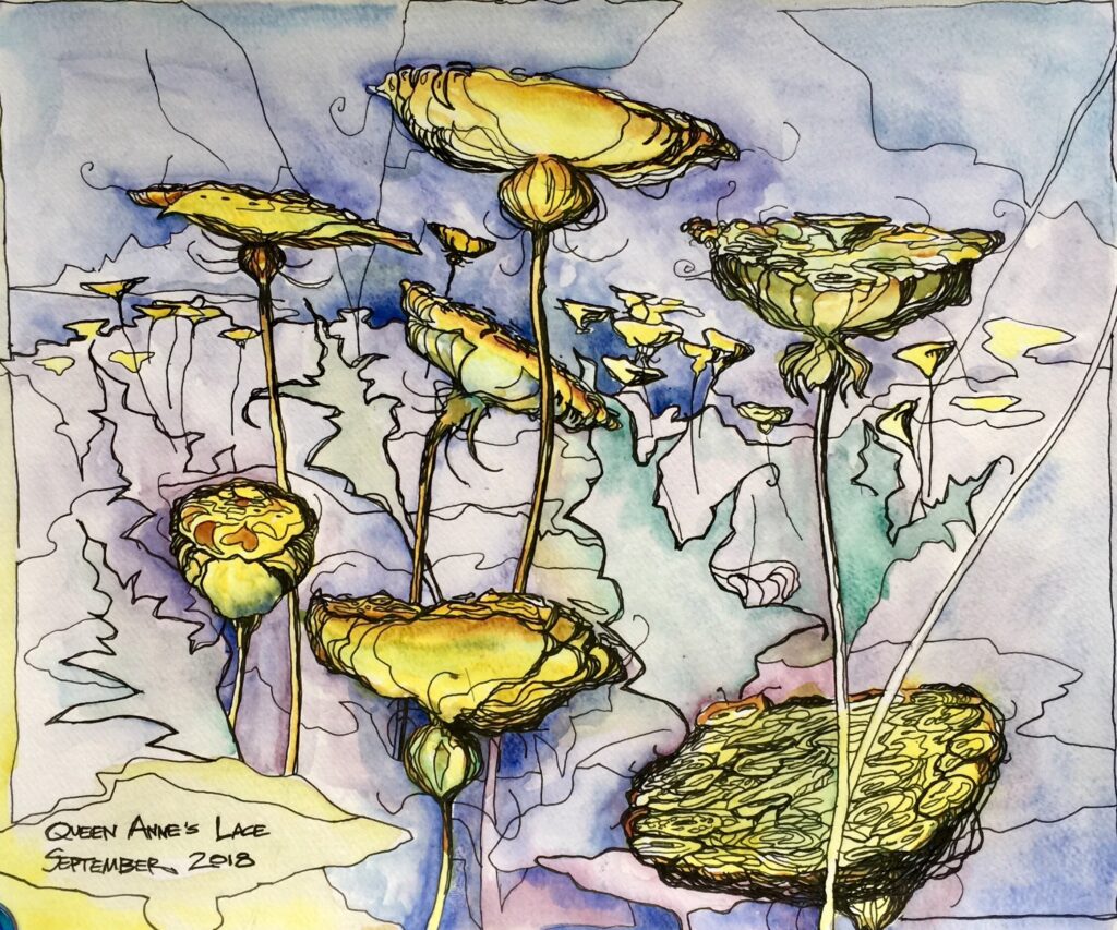 Fountain pen, colored pencil, watercolor, on Arches 10 X 14 coldpress WC paper. I have an endless fascination with houses